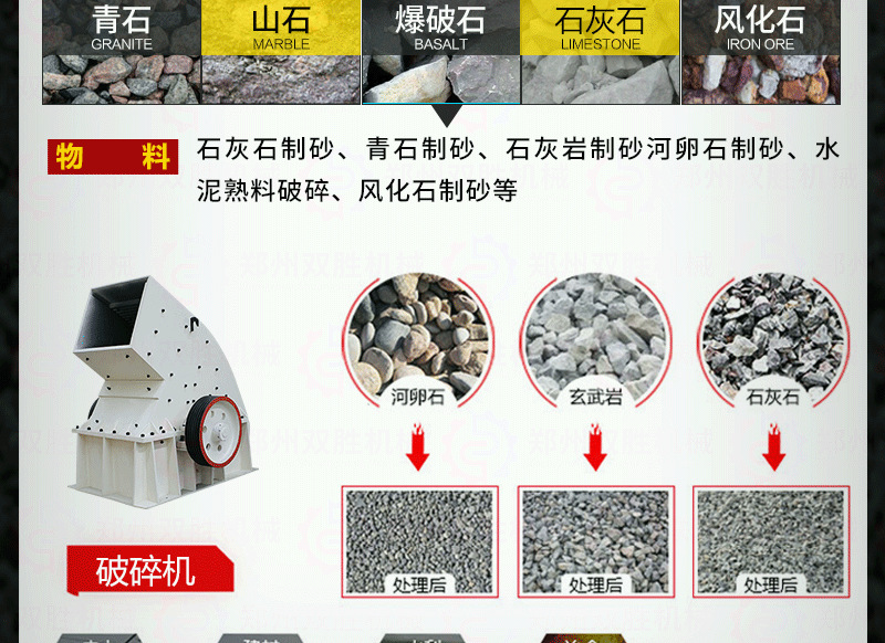 錘式制砂機(jī)的進(jìn)料口和破碎腔很大,適宜于大塊物料破碎,特殊的結(jié)構(gòu)能一次破碎成型比一般破碎機(jī)效率高;工作部件為轉(zhuǎn)子,轉(zhuǎn)子由錘 頭、主軸、錘柄、圓盤(pán)、銷(xiāo)軸等組成;轉(zhuǎn)子在電機(jī)的帶動(dòng)下高速轉(zhuǎn)動(dòng),高速轉(zhuǎn)動(dòng)的轉(zhuǎn)子將由進(jìn)料口進(jìn)入破碎腔內(nèi)的物料進(jìn)行破碎,篩板在轉(zhuǎn)子下邊,符合要求的物料 由篩板篩選排出。